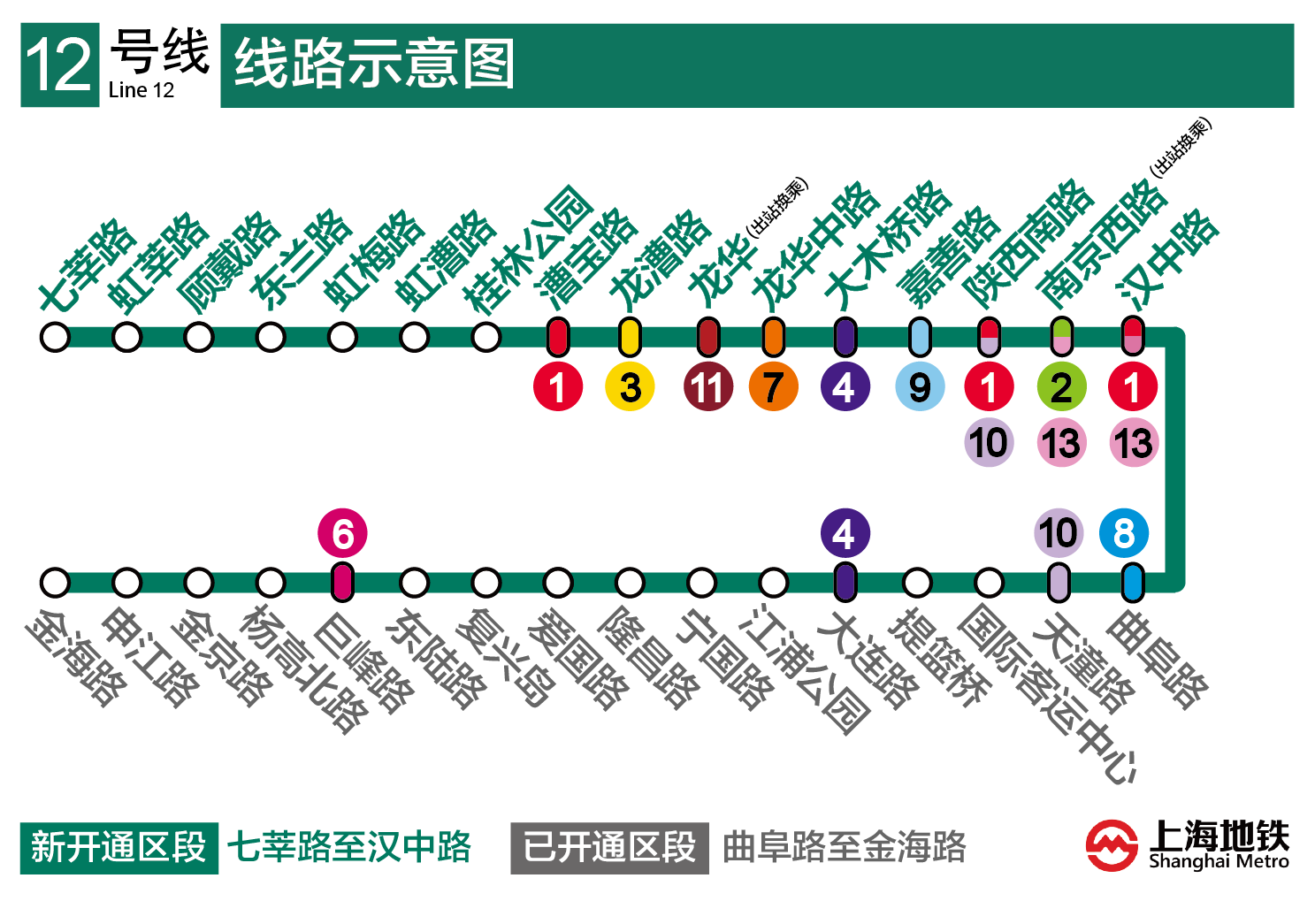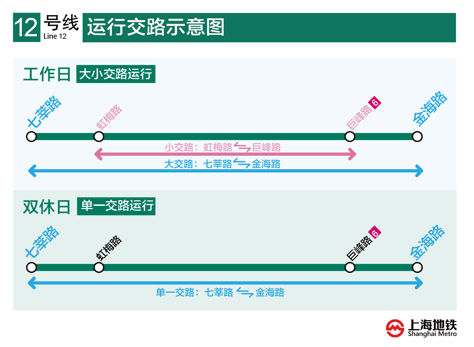 12号线七莘路站~曲阜路站开通试运营后,工作日全线将开行大小交路。大交路:七莘路站~金海路站;小交路:虹梅路站~巨峰路站。而双休日全线开行单一交路,即七莘路站~金海路站。