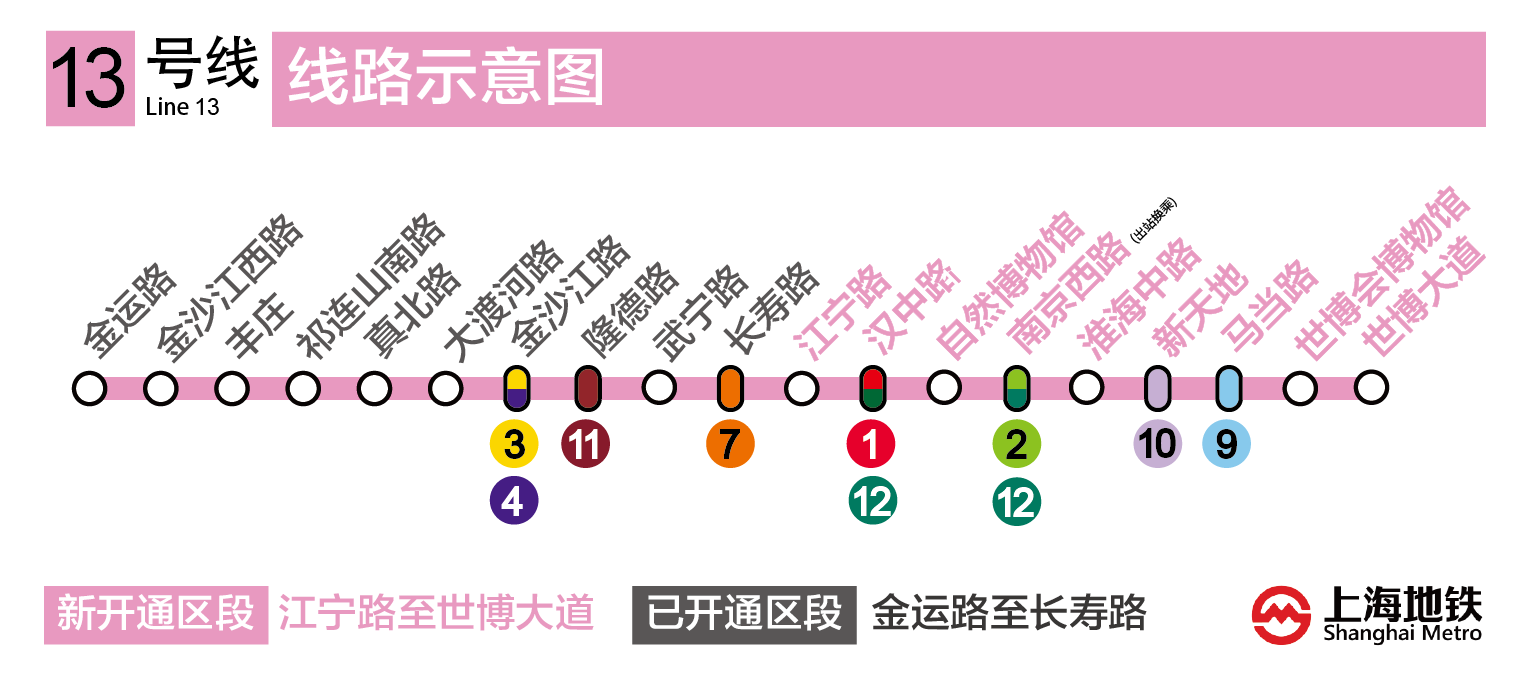 本次开通试运营的区段为长寿路站(既有车站)~世博大道站,共9座新建车站。其中,4座为换乘站,南京西路站为虚拟换乘站。