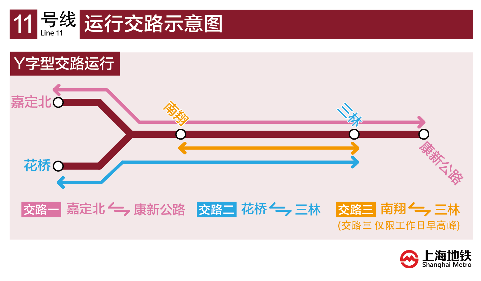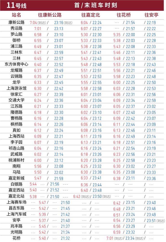 11号线罗山路站~康新公路站开通试运营后,全线运营交路及运营时间保持不变。既有车站首末班车时间不变,新开通车站康新公路站往嘉定北站首班车6:04,末班车22:24;往安亭站末班车22:19;往花桥站末班车21:54。秀沿路站往嘉定北站首班车6:07,末班车22:27;往安亭站末班车22:22;往花桥站末班车21:57;往康新公路站首班车7:01,末班车23:13(首末班车时刻详见下图)。