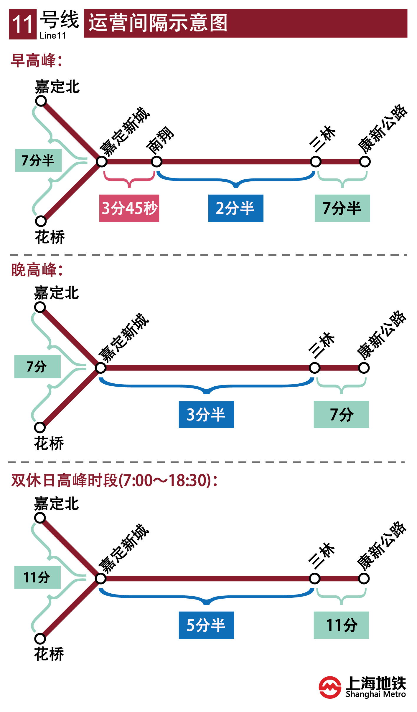 工作日早高峰时段,南翔至三林区段平均间隔2分半;嘉定新城至南翔区段平均间隔为3分45秒;嘉定北至嘉定新城、花桥至嘉定新城、三林至康新公路区段间隔为7分半。工作日晚高峰时段,嘉定新城至三林区段列车间隔为3分半;嘉定北至嘉定新城、花桥至嘉定新城、三林至康新公路区段间隔为7分钟。双休日高峰时段,嘉定新城至三林区段间隔为5分半,嘉定北至嘉定新城、花桥至嘉定新城、三林至康新公路区段间隔为11分钟。