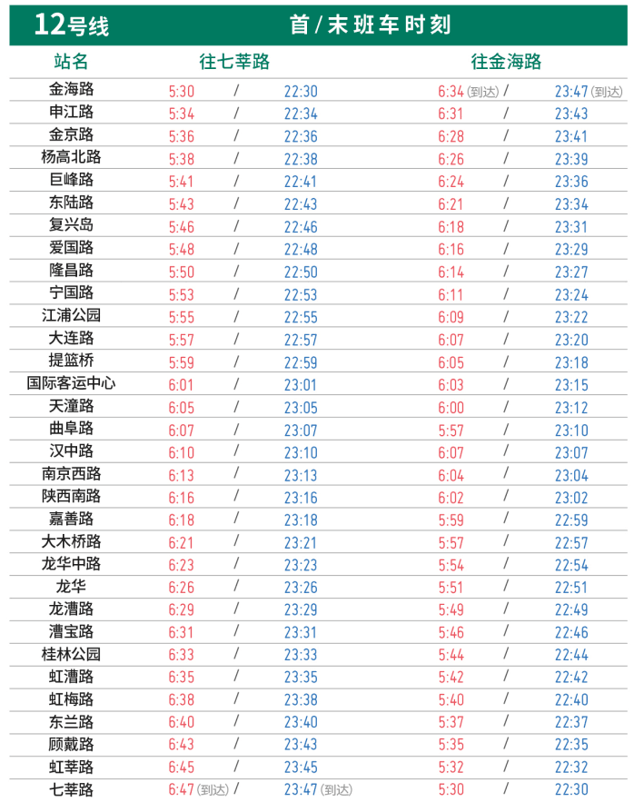 12号线七莘路站~曲阜路站开通试运营后,全线运营时间5:30~23:47。金海路站往七莘路站首班车5:30,末班车22:30;七莘路站往金海路站首班车为5:30,末班车为22:30(具体详见下图)。