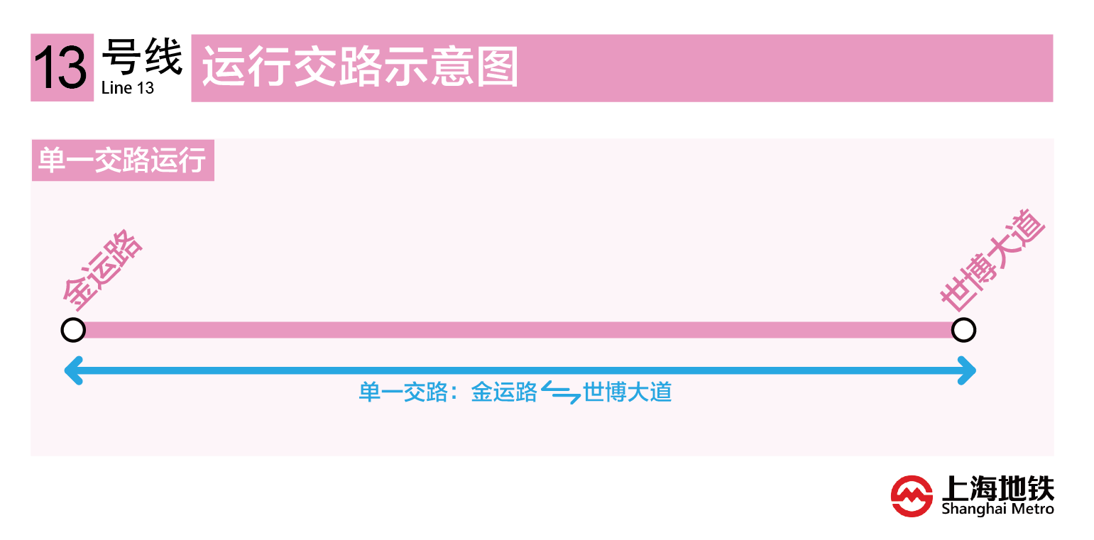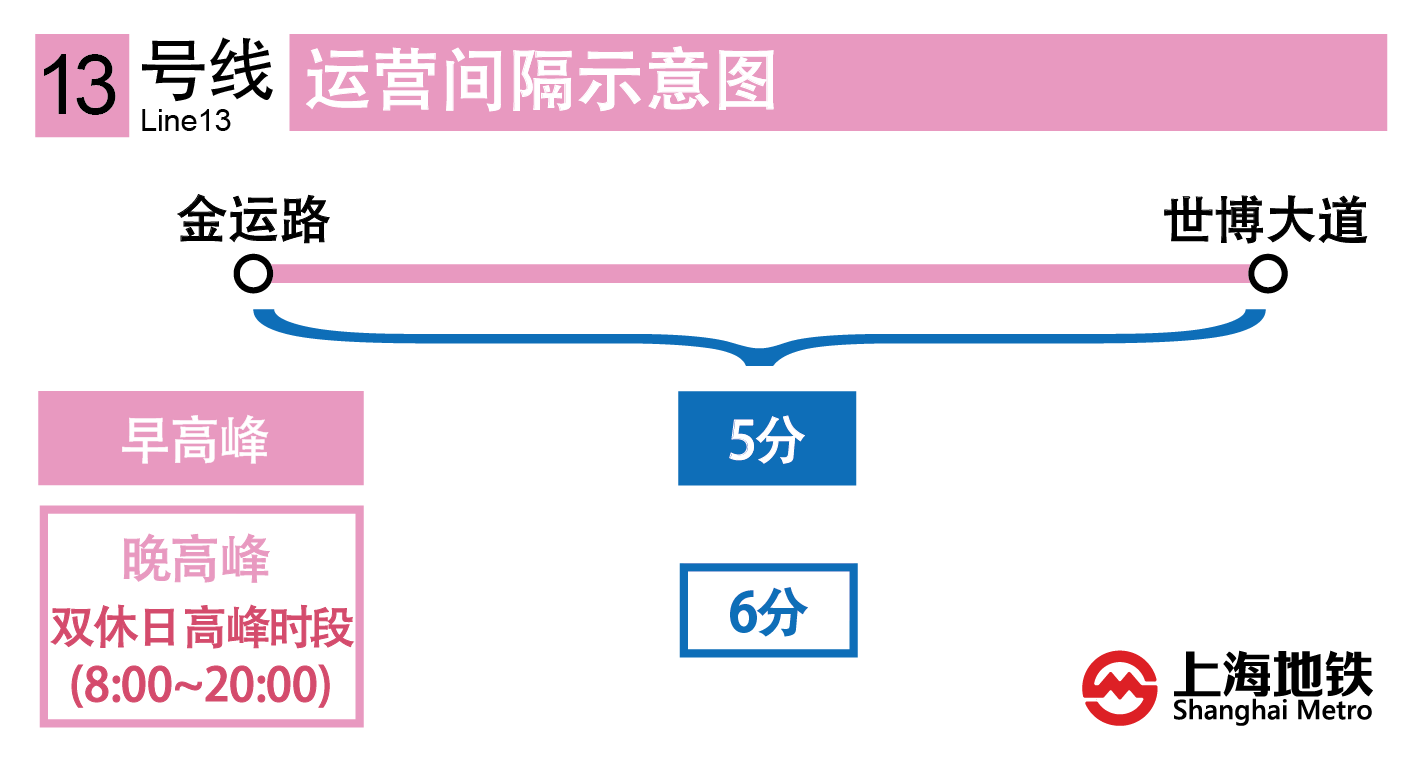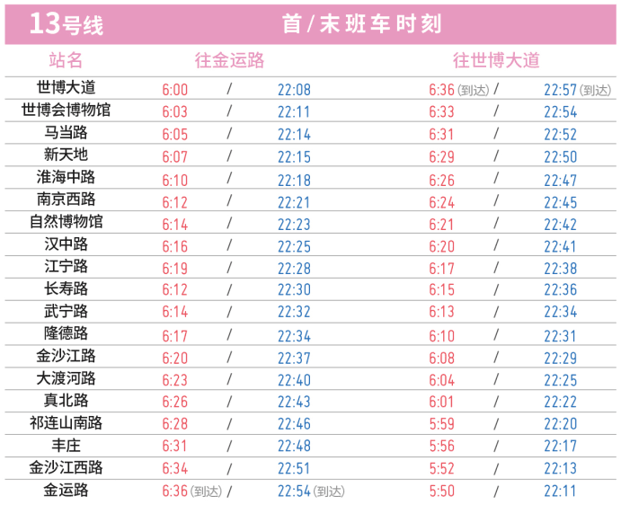 13号线长寿路站~世博大道站开通试运营后,全线单一交路运营,即金运路站~世博大道站。全线运营时间5:50~22:57。金运路站往世博大道站首班车5:50,末班车22:11;世博大道站往金运路站首班车6:00,末班车22:08(具体详见下图)