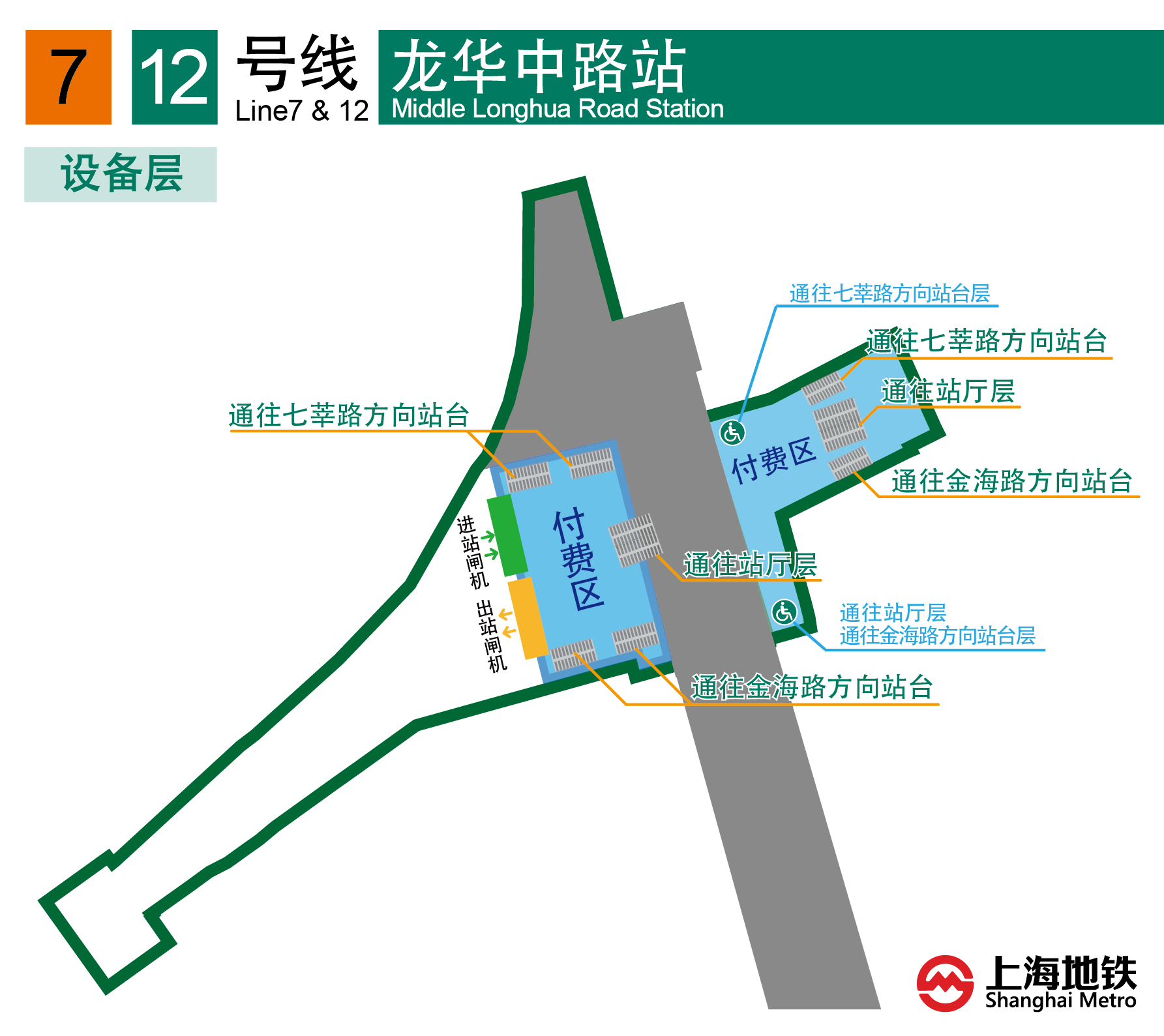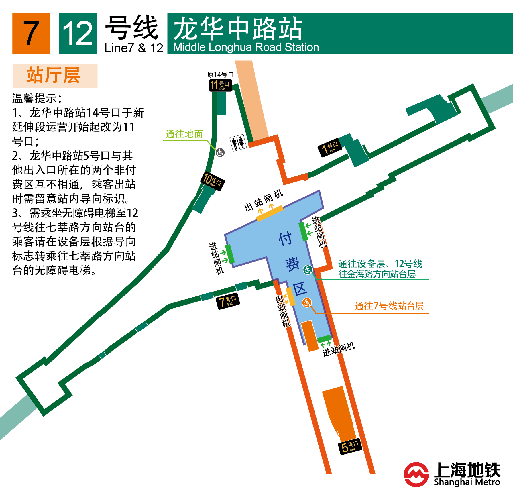 【提示3】12号线龙华中路站站层结构特殊,请乘客根据导向选择乘行与出入。
