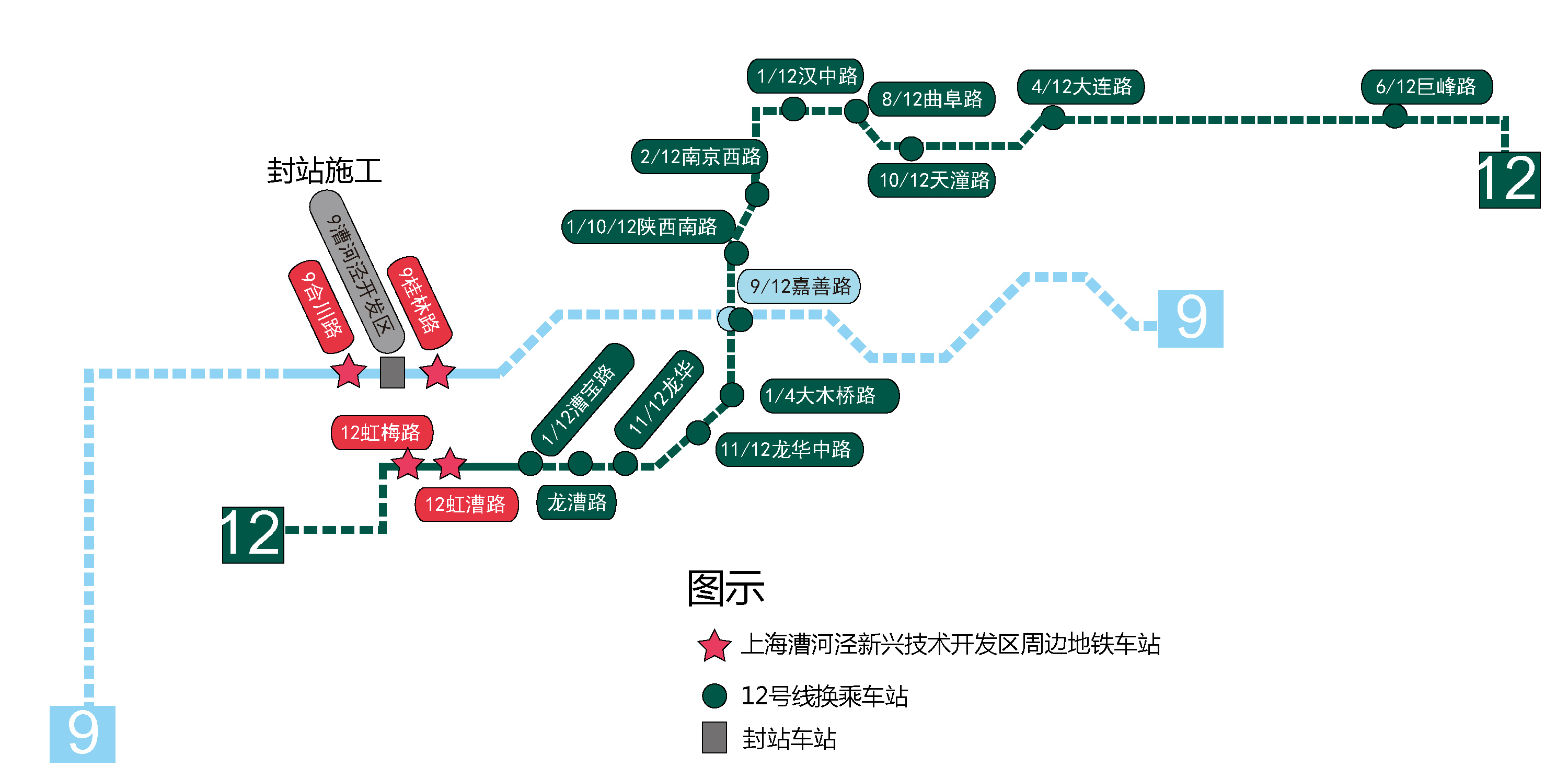 封站改造期间,前往9号线漕河泾开发区站的乘客,可至该站相邻车站,即:9号线合川路站、桂林路站或12号线虹漕路站、虹梅路站,也可换乘其它地面交通。