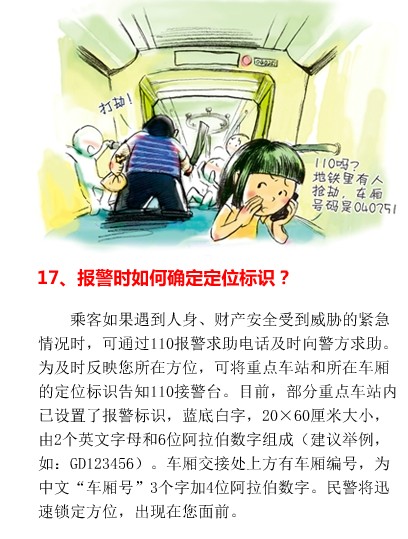 乘客如果遇到人身、财产安全受到威胁的紧急情况时,可通过110报警求助电话及时向警方求助。为及时反映您所在的方位,可将重点车站和所在的车厢的定位标识告知110接警台。目前部分重点车站内已设置了报警标识,蓝底白字,20×60厘米大小,由2个英文字母和6位阿拉伯数字组成(如:GD123456)。车厢交接处上方有车厢编号,为中文“车厢号”三个字加4或5位阿拉伯数字。民警将迅速锁定方位,出现在您面前。