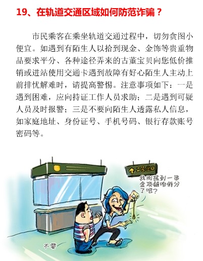 市民乘客在乘坐轨道交通过程中,切勿贪图小便宜。如遇到有陌生人以拾到现金、金饰等贵重物品要求平分、各种途径弄来的古董宝贝向您低价推销或进站使用交通卡遇到故障有好心陌生人主动上前排忧解难时,请提高警惕。注意事项如下:一是遇到困难,应向持证工作人员求助;二是遇到可疑人员及时报警;三是不要向陌生人透露私人信息,如家庭地址、身份证、手机号码、银行存款账号密码等。
