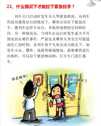 列车关门启动时发生夹人夹物等紧急状况,而列车仍没有驶离站台的情况下,乘客应该拉下紧急拉手,使列车迫停于站台,争取到处理的空间和时间。另一种情况是,当列车在运行时发生重大不可预见的灾难性事件,严重危及乘客人身安全可能造成伤亡的时刻,且列车处于失电动力状态下,如发生火灾、爆炸、地震等极端情况,需要乘客进行自救时,可以拉下紧急制动闸,打开车门进行逃生。