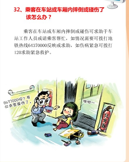 乘客在车站或车厢内摔倒或碰伤可求助于车站工作人员或请乘客帮忙,如情况需要可拨打地铁热线64370000反映或求助,如伤病紧急可拨打120求助紧急救护。