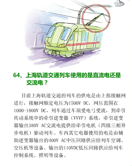 目前上海轨道交通列车的供电是由上部接触网进行,接触网额定电压为1500V DC,网压范围在1000—1800V DC,列车通过车顶受电弓受流,到牵引传动系统中的牵引逆变器(VVVF)系统,牵引逆变器输出380V AC交流电提供给牵引电机(四级三相异步电机)驱动列车。车内其它电器使用的电是由辅助逆变器输出的400V AC中压回路供应给列车空调、空压机等设备,输出的110V DC低压回路供给列车控制系统、照明等设备。