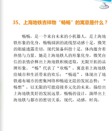 畅畅是一个来自未来的小机器人,是上海地铁形象的化身,畅畅圆润的流线型动感十足,微笑的眼睛透露亲切,现代装备科技十足,体内蕴含着热情与力量。她是上海地铁人的形象化身,微笑自信的表情诠释出上海地铁积极进取,无限开拓的品牌形象。“畅”代表了欢畅、畅通、畅想。“欢畅”寓意着上海地铁给城市和生活带来的欢乐;“畅通”体现出地铁遍布城市的密集网络和畅通无阻的发展态势;“畅想”以无限的可能迎接多元化的未来,描绘出上海地铁美好的发展愿景。畅畅的设计演绎出上海地铁与城市的密切关系,现代、动感、时尚。